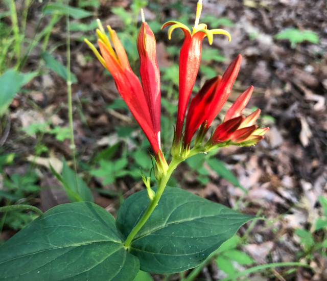 La indian pink es una hierba que forma mechones con pétalos fusionados de 5 lóbulos que son rojos por fuera y amarillos por dentro. Los estambres están unidos y se alternan con los pétalos.