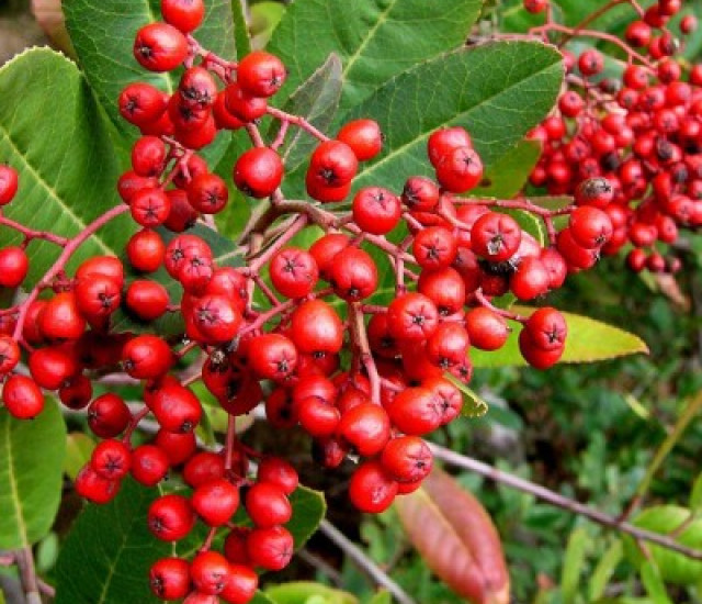 Toyon fruits are similar to small apples – each bright red berry (technically a “pome” like an apple) is 0.2 to 0.4 in (5 to 10 mm) in diameter and has a mealy pulp that contains 3 to 6 brown seeds in the middle. The conspicuous fruits are loosely clustered at stem tips and can persist throughout the autumn and winter in some locations (making it a common plant for winter holiday arrangements).