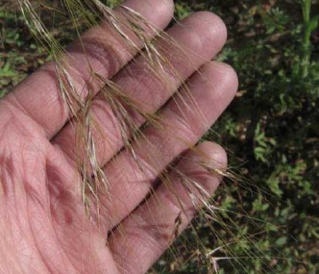 Needlegrasses grow in clumps and have rolled leaves and only one finely hairy flower in each spikelet. Purple needlegrass is distinctive in having an open loose cluster of flowers with spreading branches called "panicles" Look for the pair of reddish, narrow, leaf-like structures (called "glumes") at the base of each floret; the glumes are tapered from base to tip, with the tip narrowing to a sharp point (hence the name needlegrass).