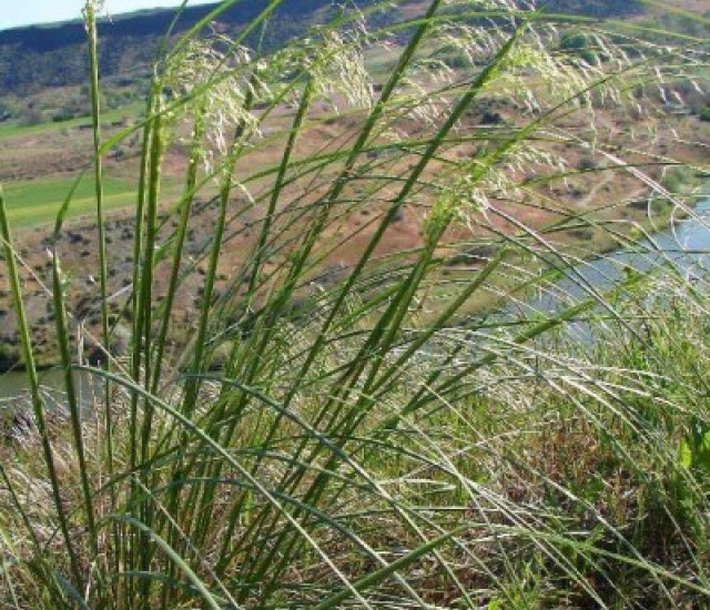 Indian ricegrass is 8 to 30 inches tall and grows in bunches. It has many tightly rolled, slender leaves, growing from the base of the bunch giving it a slightly wiry appearance. The leaves are about 1-2 mm wide and 15-25 cm long. The flowers are small and appear on the very tips of each hair-like branch of the inflorescence, called a panicle. The 'branches' of the panicle are widely spread out. As with many grasses, the flowers are dainty and you will need to look closely to see them. Indian ricegrass produces small seeds that are rounded and black to brown in color. This grass is typically found in sandy or otherwise well-drained soils. The seeds also have a fringe of short, dense white hairs. Source: USDA PLants