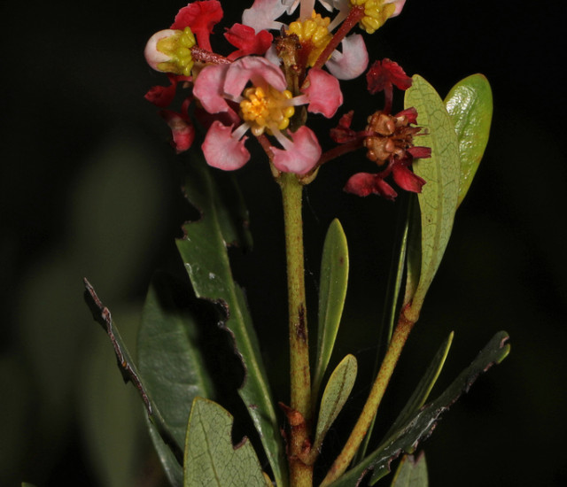 The small, loosely clustered flowers start off white, but turn pink and red. Crinkled looking petals are attached to the flower by narrow stalks.