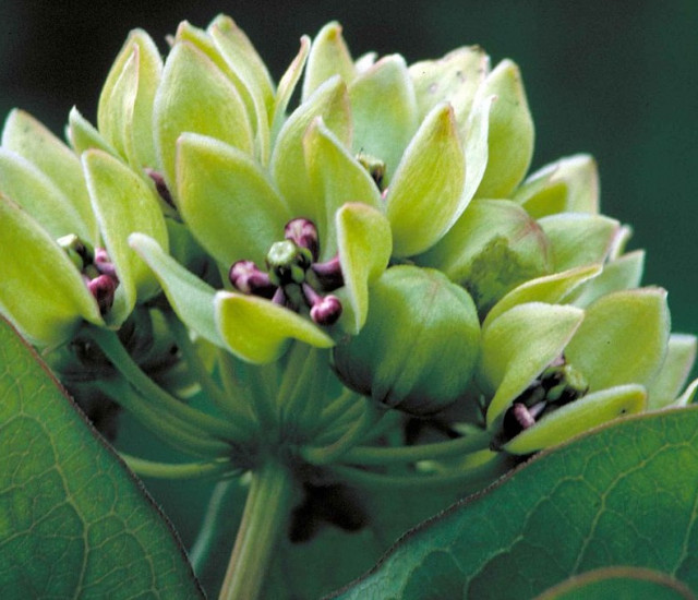 Flower clusters typically 3-5" across with about 10 flowers in a cluster. Flowers are white to yellowish green with some purple on the hoods in the flower center. Flower are without horns. The petals curve up and around the hoods.