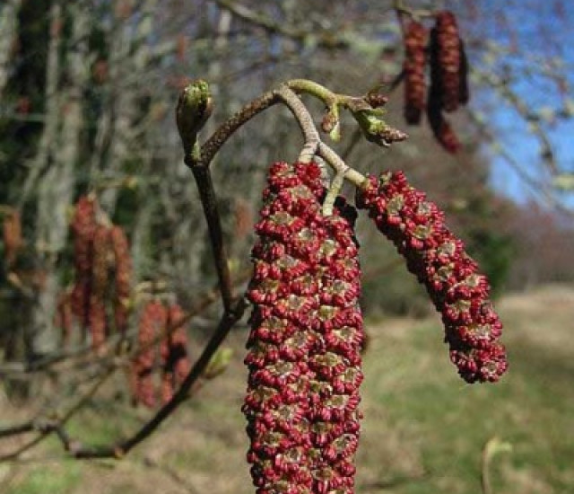 This common deciduous tree is often found along roadsides and old clearcuts. Its male (staminate) flowers hang in distinctive tassel-like catkins, and the female flowers look like tiny pinecones.
