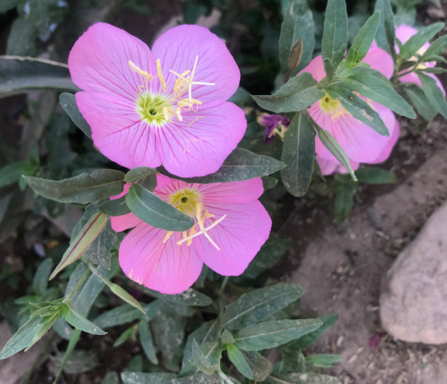 The pink evening primrose has four broad petals that start white, and turn a rosy pink with age. The petals form a cup or bowl shape, with yellow reproductive parts in the center. Flowers are nearly 2 in in diameter. Flowers are very fragrant.