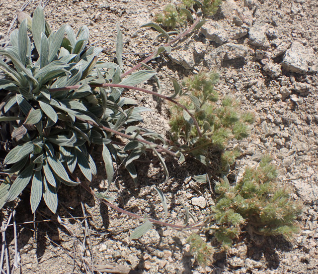 Leaves of silverleaf phacelia are deeply veined, distinguishing them from other Phacelia species. They are also gray-green in color due to silvery hairs on the leaves. Leaves are lance-shaped to oval, and smooth-edged. Leaves can seem to be clustered coming out of the ground or be attached to stems that either stand erect or lay horizontally on the ground. The stems are stiff-hairy, but not glandular (sticky) and are also grayish-green in color.