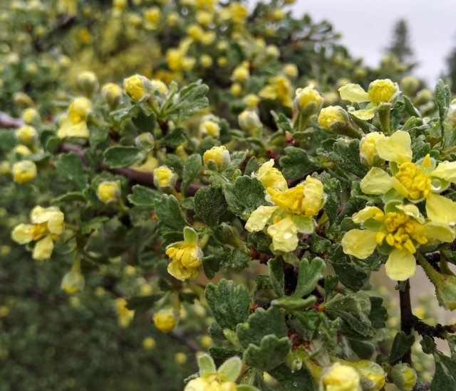 Antelope bitterbrush is a large semi-evergreen shrub with small, leathery, three-lobed leaves dotted with many tiny pale-yellow 5 petaled flowers when blooming. The flowers are fragrant but the leaves are not.