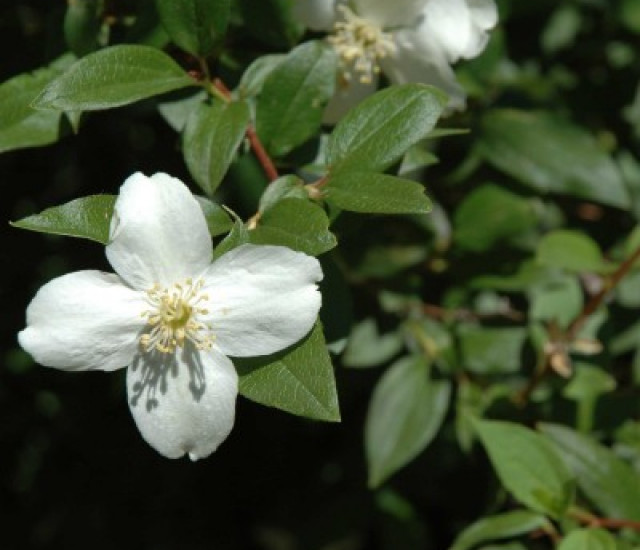 Flowers can appear in clusters of 3 to 11 at tips of branches. Generally 0.79 to 1.18 in (2 to 3 cm) wide with 4 to 5 white-ivory, round or notched petals and 4 to 5 sepals (petal-like structures). Flower centers contain 25 to 40 yellow stamens. Fragrance similar to orange blossoms. Flowers bloom May to July.